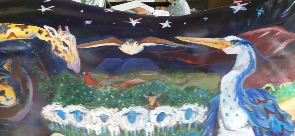 I considered this a public works project and therefore felt it needed a purpose of worthiness. Each animal adjoins peacefully or even melds into its neighbor. Just as we with all of our relations with the abundant life of our planet must live together, let us be reminded that we must tolerate and meld our beliefs.